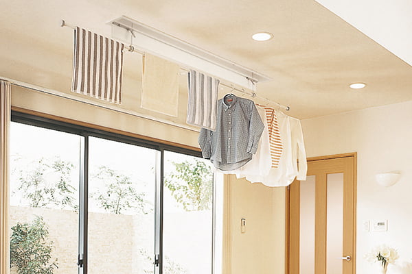 使用後は天井や壁に収納できる室内物干しユニット。