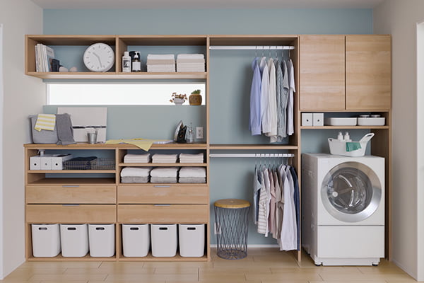 洗濯機、物干し、収納を1カ所に集めることで、「洗う→干す→しまう」の家事をまとめてスムーズに行えます。