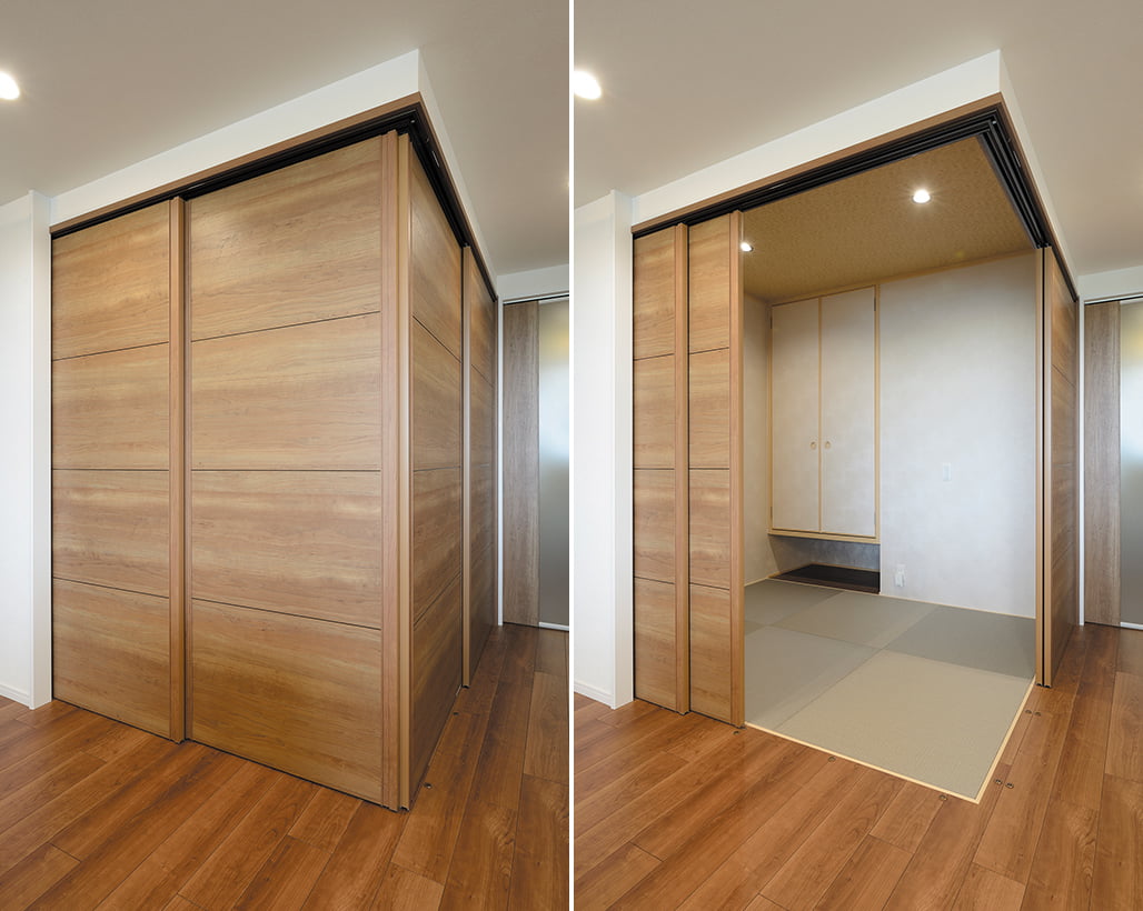和室を囲むように間仕切り扉を設置し、扉を閉じると個室に