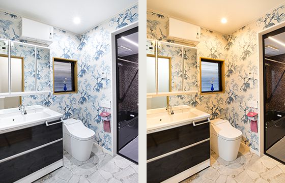 照明は、洗面、浴室ともに調光式を提案し、くつろぎたい時はオレンジの光を、掃除をする時は汚れが見えやすい白い光を使っていただけるようにしました。