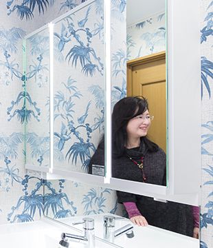 洗面化粧台は、メイクがしやすいように正面から顔を照らす縦型のLEDライトを備えた「シーライン」を設置。