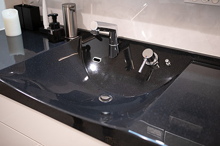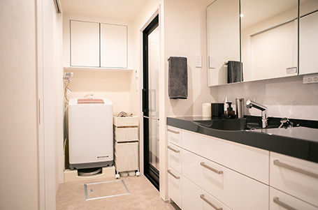 キッチンからつながる洗面室がこちら。ホワイトを基調とした空間の中に、ブラックの洗面カウンターがキリっとした表情を醸し出す大人っぽいカラーリングでまとめました。タオルハンガーや小物類もシルバーで統一し、さらにスタイリッシュな雰囲気に。洗面ボウルはカウンターと一体型で継ぎ目がないため汚れが溜まりにくく、お手入れがラクなのもうれしいポイントです。