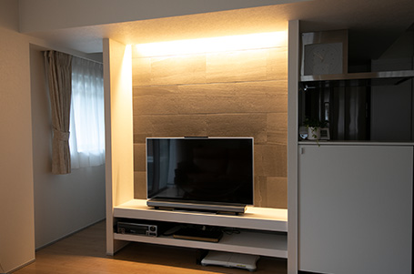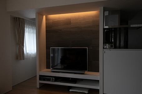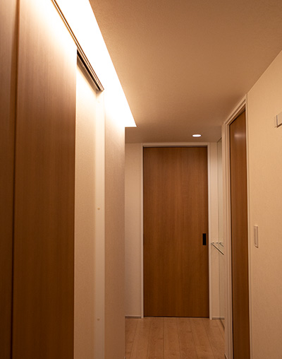 空間を演出するあかりにもこだわりました。「以前から気になっていましたが、モデルルームを見に行って、光でこんなに雰囲気が変えられるんだと実感した」ことから、導入を決められたそう。廊下には、すき間からこぼれるようなやわらかい光が魅力の間接照明を設置したほか、リビングダイニングにはダウンライトをしつらえ、シーンに合わせた光の演出を楽しんでいると言います。またAVボード上に設置した間接照明は、映画を見るときにつけると、臨場感を味わえるそう。
