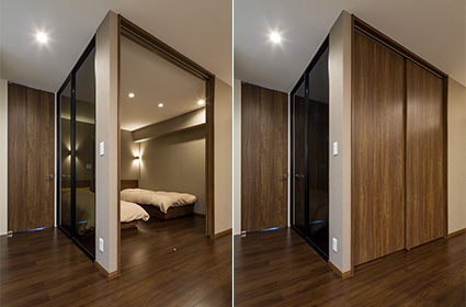引き戸でオープンにすると、リビングとつながる空間になりホテルライクと開放感を意識した設計です