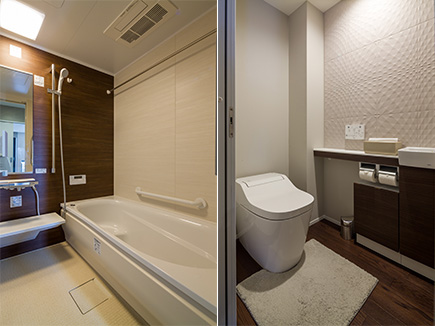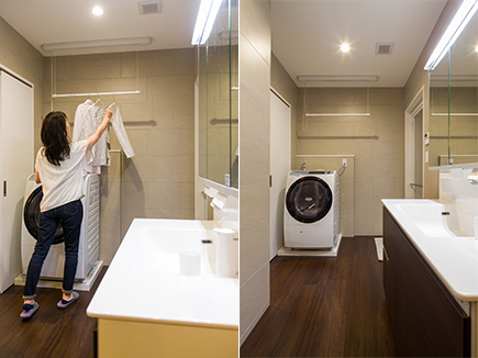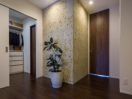 リビングにつながる、洗面室の壁面に広めのタイルを貼ると上質な雰囲気の“見せる洗面室”になり、寝室はオシャレなガラス壁で開放感にあふれました。