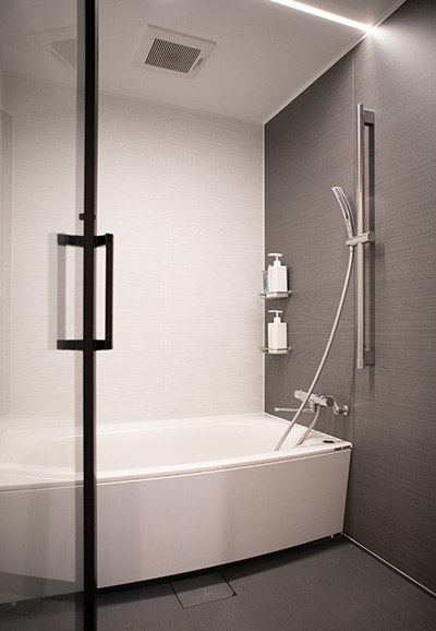 「今回のリフォームで一番変えたかったのがバスルーム」という奥様。経年で汚れが落ちにくく、掃除に時間がかかるようになったことから、新しい設備に入れ替えると同時に、ライフスタイルに合わせて必要最低限の機能を厳選しました。床材には掃除しやすい素材を選び、汚れても目立ちにくいグレー色をセレクト。扉もお手入れしやすいガラス素材にしました。また以前からあまり使用していなかったカウンターや追い炊き機能を無くし、さらに給湯器のリモコンを取り付けないことで、「すっきりしてお掃除する場所も少なくなりました」と奥様。