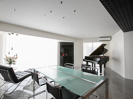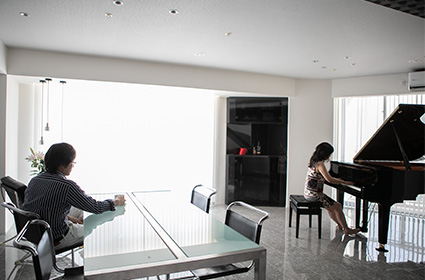 LDKのメイン照明にはダウンライトを設置し、コーブ照明やペンダントライトをプラスして空間をムーディーに演出しています。これらの照明は『リビングライコン』で一括コントロール。シーンに合わせたあかりを設定できます。「朝食時」「くつろぎ」「ピアノ演奏時」など5つのシーンを設定し、気分に合わせて明かりの変化を楽しみます。