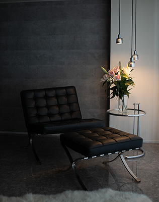 LDKの一角にはペンダントライトとパーソナルチェアを配置し、くつろぎコーナーをつくりました。低い位置のあかりがくつろぎの時間を豊かに演出します。