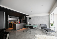 第2期の工事では、間取り変更を伴うLDKと玄関のリフォームを行いました。それと同時にインテリアのカラースキームも変更。もともとモダンインテリアがお好きだったそうですが、マンション購入時はオーソドックスな色しか選べなかったので、今回のリフォームでは、ホワイトやグレーなどモノトーンのカラーを中心にセレクトしました。光の加減によって色が変わるメタリックカラーのキッチンの扉や黒のキッチンカウンターがモダンなインテリア空間をきりっと引き締めます。