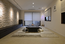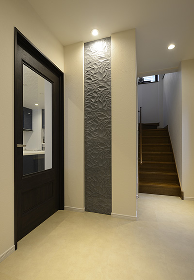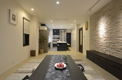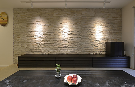 リビングは教室の後に生徒さんとお茶を飲みながらおしゃべりしたり、ご主人がご友人を呼ばれてお酒を飲まれたり、働くスタッフとの懇親会を開かれたりと、ご夫婦の大切な人がくつろいで過ごせる場として大活躍しています。くつろげる空間づくりも工夫しました。リビングを上質な雰囲気に彩るアクセントウォールは「時間によって光の当たり具合が変わり、リビングの表情を豊かにしてくれています」と話されます。