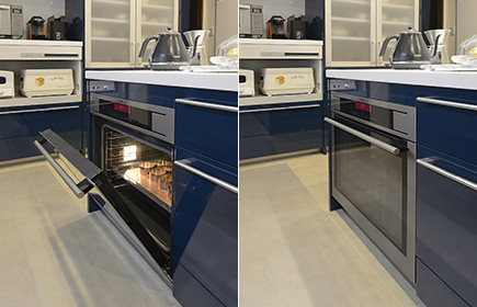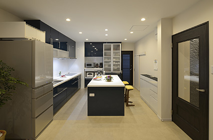 ケーキ教室専用スペースには中央に同時に調理できるよう大型のアイランドテーブルを設置しました。奥様こだわりの大型オーブン(71L)をアイランドテーブルに組み込めることが決め手となり、パナソニックの『Lクラスキッチン』を採用されたそうです。アイランドテーブルの周囲には、教室専用の冷蔵庫、I型キッチン、パンこね機やミキサーなどの家電や食器を収納したカップボードを機能的に配置。またキッチン横の階段下のスペースには教室で使う常温保管の食材・型・キッチンツールなどをまとめて収納しました。
