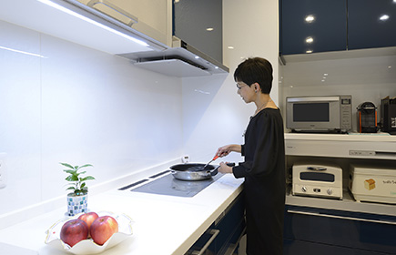「これまでは教室で使う食材や道具が別のフロアにバラバラに収納されていたので、教室の準備も上下階行ったり来たりで大変でした。今回のリフォームでは2階にすべて集結させたので、効率よく動けます。担当の方に何度も相談に乗ってもらい、ここまでの形になりました」と奥様はにっこり。