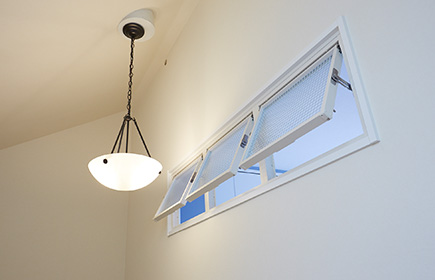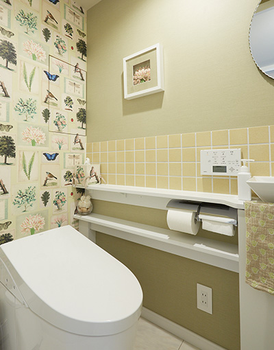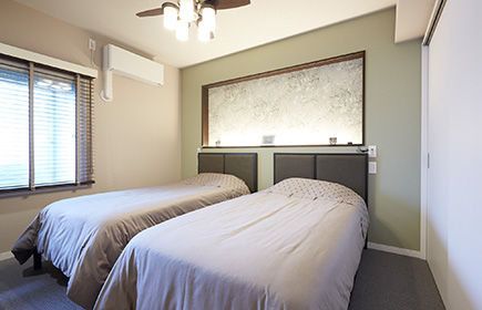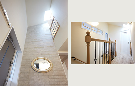 一方、寝室はベージュを基調とした落ち着きを感じられる空間に。壁の一部を額縁に見立てたしつらえにして間接照明を埋め込むことで、 洗練された雰囲気に仕上げられています。またトイレは個室空間ということで、思い切ってイエローを基調とした遊び心あふれる内装に。 階段ホールは素材の質感を生かした南欧風の雰囲気にするなど、空間ごとに違った気分で日常を楽しく過ごす工夫が満載です。