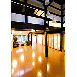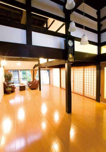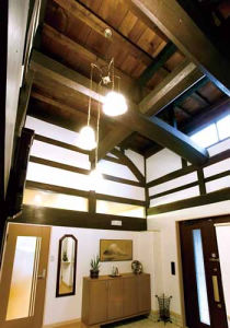 長い年月を経て独特な色合いと風格を持つ梁がゲストをお迎えしてくれる玄関ホール
