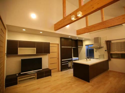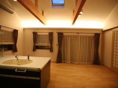 コンパクトにまとまった使いやすいキッチン。勾配天井の吹き抜けは開放感にあふれ天窓からの自然光がふりそそぐ居心地のよいリビングになった。
