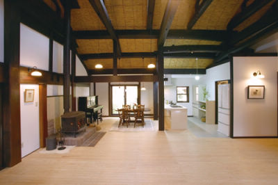 天井を取り払い、壁を撤去して蘇った江戸時代末期の土間空間全景。高気密・高断熱により、厳寒の冬でも入った瞬間に温もりが全身を包みます。ご主人のかねてからの念願だった薪ストーブが絶えず燃やされ、この暖房だけで広い住まいのどこにいても均一の暖かさを実現。屋根に開けた天窓からは明るい光が入り、土間全体をやわらかく包みます。取り去った鴨居を玄関の框に再利用するなど、できるだけ廃材を出さない工夫も。万全の耐震補強も施して、将来にわたり安心して快適に暮らせる住まいになりました。