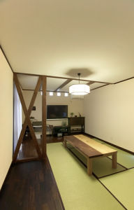 増築したリビング。増築部分の筋交いが補強とインテリアのアクセントを兼ねています。