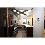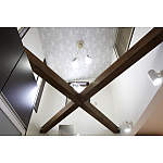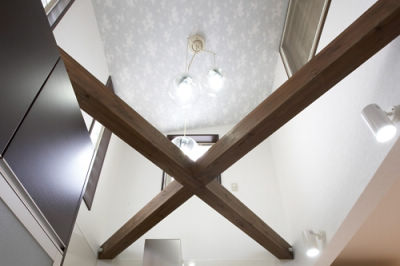 L型のキッチンの背面にカップボードを設置し、動線が短くなって作業効率もアップ。趣味のパソコンもできる家事コーナーとして重宝されているそう。上部の梁は耐震補強も兼ねています。