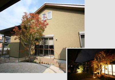 テラス越しに見えるシンボルツリーのヤマモミジがお互いのプライバシーを確保。外部の照明はすべてLEDをを使用していてアッパーライトに照らされた紅葉が昼とは違う印象です。