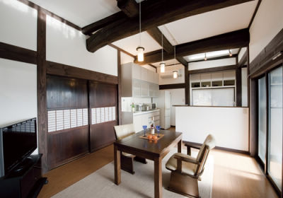 時の流れを感じる太い梁や建具と現代の先進設備が絶妙に調和したダイニングキッチン