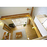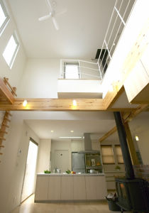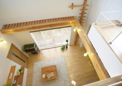 無垢材でつくったキャットウォークと梁は、ご主人の遊び心が詰まっています。子供が大きくなったら、ロープをかけてよじ登って遊ぼうと計画中。「キャットウォークは吹き抜けの窓の掃除に、とても便利ですね」とおっしゃっています