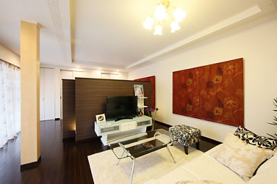 まるでホテルのスイートルームのような空間。ベッドルームとリビングを仕切るのはこのパーテーションのみ。