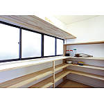 ぐるりと棚を配したパントリー。食品や小物類を大量に置けるので、キッチンはいつもすっきり