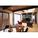 古材を使ったテーブルやシックな色のソファなど、生活を共にしてきた愛着のある家具との調和を中心にデザインされたリビングダイニング。落ち着いたブルーのアクセントウォールや自然素材を用いて北欧風にまとめられた空間は、長年お住まいのような居心地のよさを感じさせます