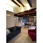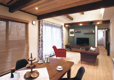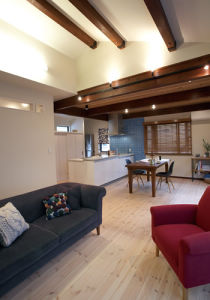 勾配天井の開放的なリビングと、既存天井を活かした落ち着いたダイニングが対照的なLDK。キッチン背面は3枚引戸の収納を設置。お料理時は全開放にして使いやすく、来客時は閉じてすっきり