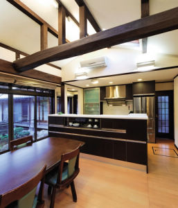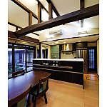 梁を活かした吹き抜けのDK。中庭に面したハイサッシの開口とトップライトで