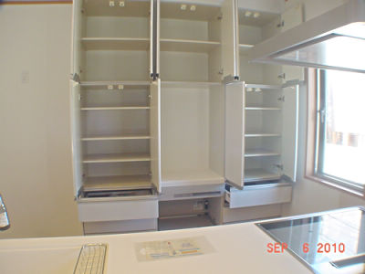 カップボードは家電収納・食器収納・ゴミ箱の収納まであるのでとても便利です。