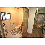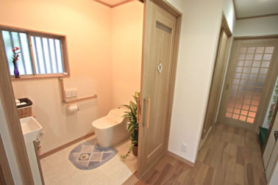 トイレの扉を3枚引戸として開口部を広くし、狭苦しさを解消。扉の敷居の段差をなくし安全性を高めた。今後の事も考えて車いす生活にも対応できるように広々とした空間とした。L字型てすりを設けて、立ち座りが楽にできるようになりました。