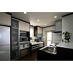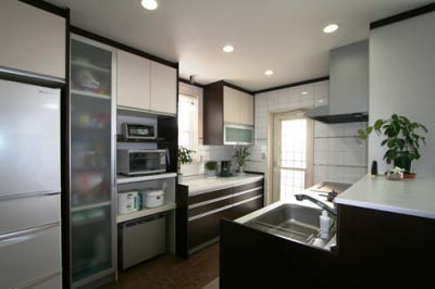 ダークセピア色とホワイトを組み合わせたオリジナルカップボード。家電・食器・食品ストックなどあらゆる物が全て収納できます。