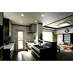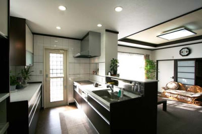 リビングから直接シンクが見えない、水切り付対面プラン。壁面はホワイトとシルバーラインのタイルでおしゃれ感を感じさせる空間に。