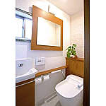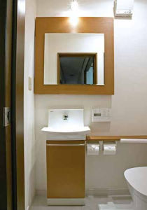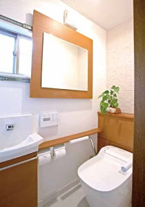 ミラーをスライドすると外光も入ってきます。壁面は吸湿性のある素材を使用、清潔感の高い色合いも素敵です。全自動おそうじトイレ「アラウーノ」はアームレスト付きタイプ