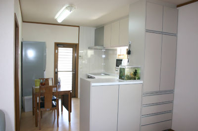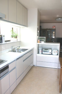 食器棚・家電収納の位置を変えることによって、食卓スペースを広く取ることが出来ました。たれ壁を撤去したので、開放感も生まれました。収納部分でほどよくキッチンの手元が隠れるので、来客時も気になりません。