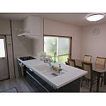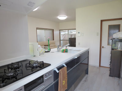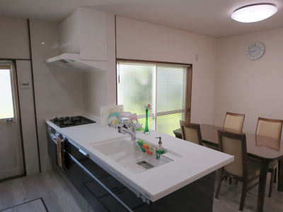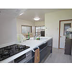 ブルーのシステムキッチンをアクセントに、ホワイトを基調とした明るくて広く感じるお部屋づくり。