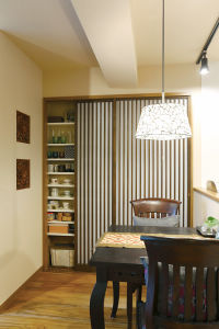 奥行20cmの効率収納には、ゲスト用の食器類がずらり。