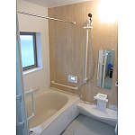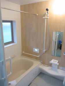 見た目にも暖かい、明るい木目柄の浴室になりました。