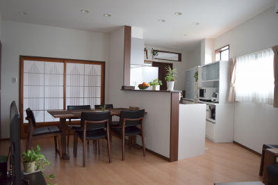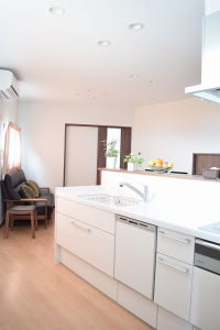 リビング側からキッチンを見ると、天井と壁の白を基調とした部屋は清潔感があり、明るい落ち着いた空間に仕上がった。
