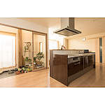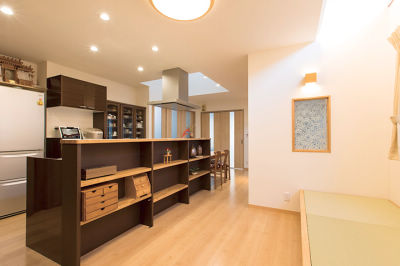 キッチンカウンターの背面は収納棚を造作。小物などを飾って見せる収納として、キッチン奥のパントリーと上手に使い分けます。