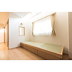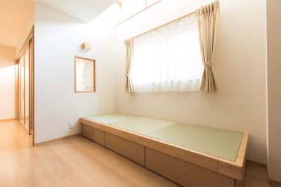リビングの一角には、腰かけて使える「畳が丘」。引き出し式の収納も便利。