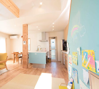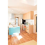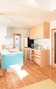 キッチンはキッズコーナーの壁に合わせたやさしいブルー。「大きな窓からたっぷり光が入り、あたたかな感じにしたかったから」という奥様のこだわり。