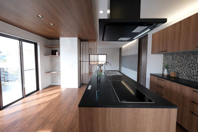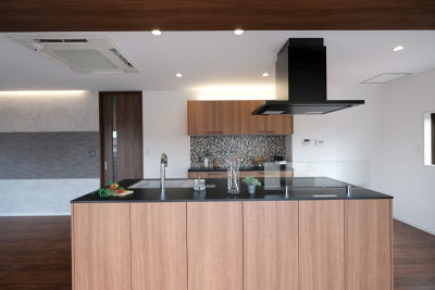 キッチンまわりに自然と家族が集まる アイランドキッチンは回遊式で飲み物を取りに行くときでもお互いぶつからずストレスのない動線