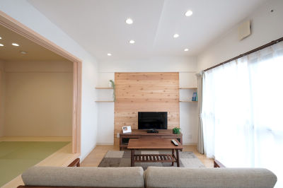 テレビボードの後ろには無垢材を貼り、リビングのアクセントに。