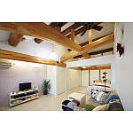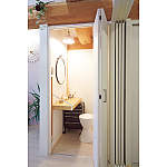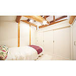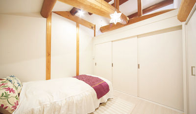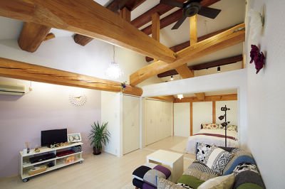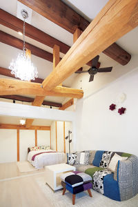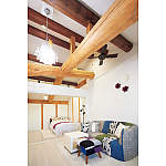 隠れていた立派な梁の質量感を活かした空間は、クロス、収納、ホワイトオークの床と、白で統一して欧州のホテルのような趣。窓からの風をシーリングファンが部屋中に運びます。