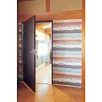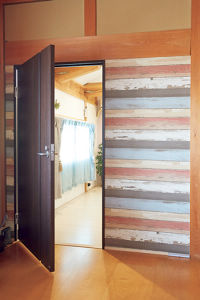 共有のホールに面した入口は、アンティークウッドの壁紙で目にも楽しく。