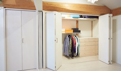 寝室とリビングの間は3枚引き戸でフレキシブルに仕切り、友達が遊びに来たときなどの目隠しに。
