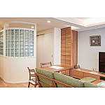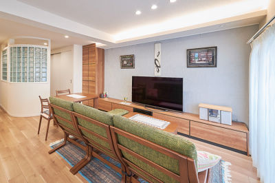 システムファニチャーで物が見えない収納を実現し、すっきり片付いたLDK。LDKとホビールームを緩やかに仕切る壁は、光が漏れるガラスブロック。
