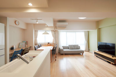 ダイニングの学習カウンターは壁付けに。テレビを見えないようにしました。